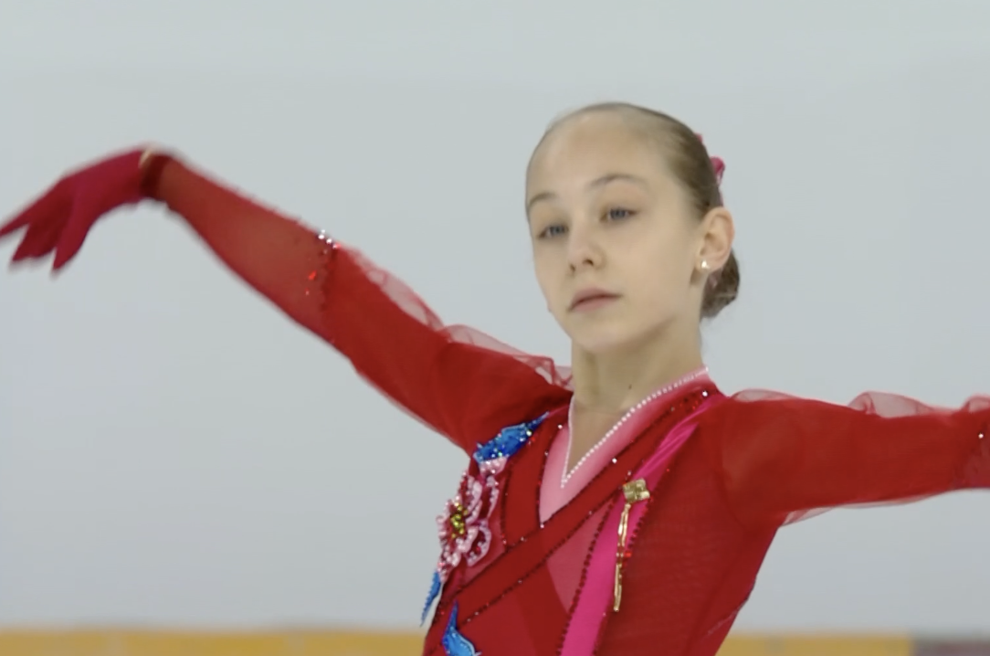 Фигуристка с красными волосами, собранными в пучок, катается под страстное танго My Love (Kovacs). По своим движениям на льду и всему образу она очень напоминает Александру Трусову.