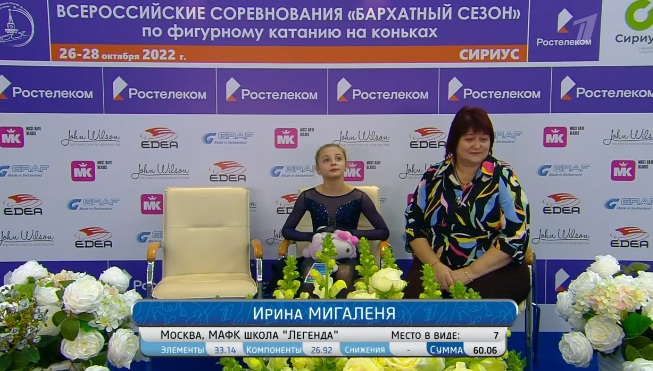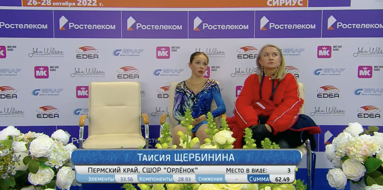 Щербинина получает за свою короткую программу 62,49 балла. Это третий результат на данный момент после учениц Тутберидзе и Плющенко — неплохо!