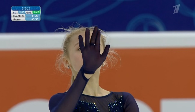 Сразу же каскад 3 лутц + 3 тулуп на хороший плюс в исполнении петербурженки, затем неплохой тройной риттбергер, а дальше вращение четвертого уровня. Во второй части проката сделала двойной аксель и отвращалась на четвертый и третий уровни.