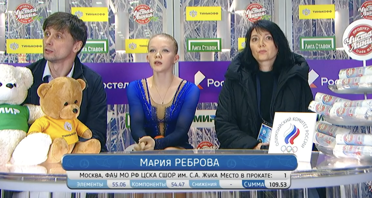 Только под конец программы Реброва начала допускать явные ошибки — с трудом выехала с последнего прыжка в каскаде двойной аксель + ойлер + тройной сальхов, а перевалилась на вторую ногу и чуть не упала с тройного флипа.