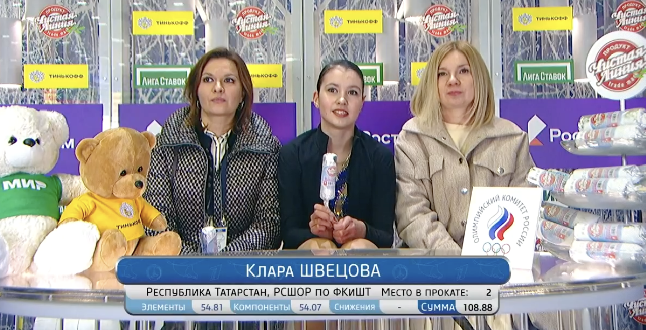 Клара уверенно исполнила тройной флип, каскад тройной лутц + ойлер + тройной сальхов и сольный тройной тулуп. Местная публика радостно аплодирует своей родной спортсменке.