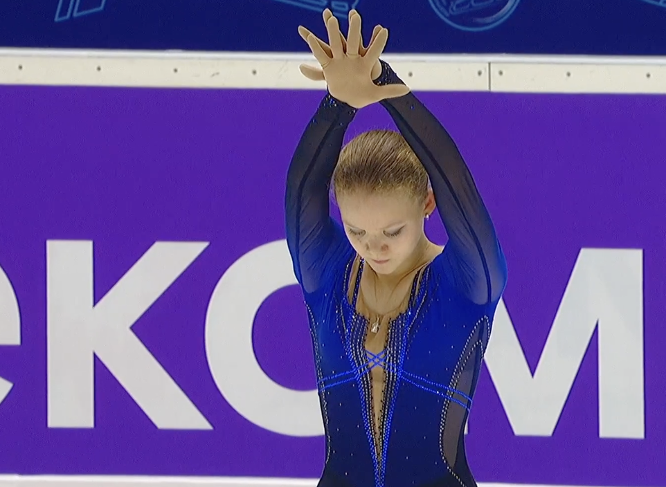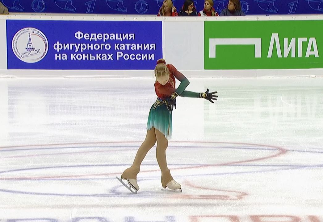 После этого она чисто исполнила тройной флип + двойной тулуп, но тут же ошиблась на следующем каскаде: скрутила лишь двойной тулуп + ойлер + двойной сальхов вместо 3+3, как было запланировано.