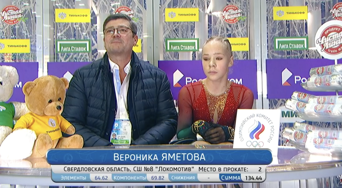 Яметова чисто исполнила каскад тройной флип + двойной тулуп (так и было задумано — 3+2), а затем показала тройной лутц + ойлер + тройной сальхов, но уже с небольшой ошибкой — замешкалась на выезде с первого прыжка и чуть пошатнулась. Судьи чуть сняли баллы за это.