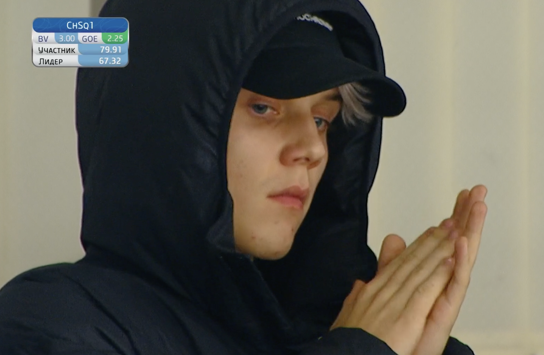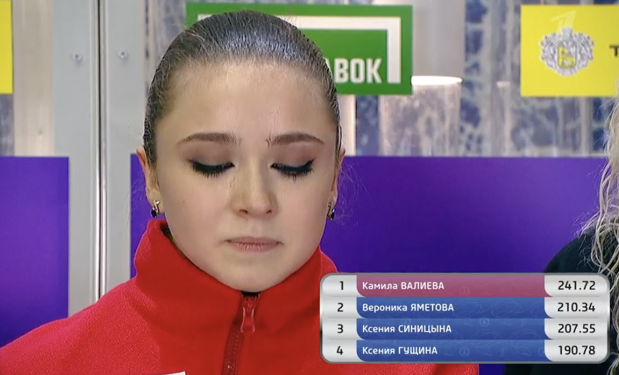 В концовке Камила по традиции закрыла лицо капюшоном, прячась от внимания публики на фоне допингового скандала. Однако она уже осталась абсолютно спокойной — без слез, как на первых соревнованиях. Видимо, уже привыкла к своей программе.