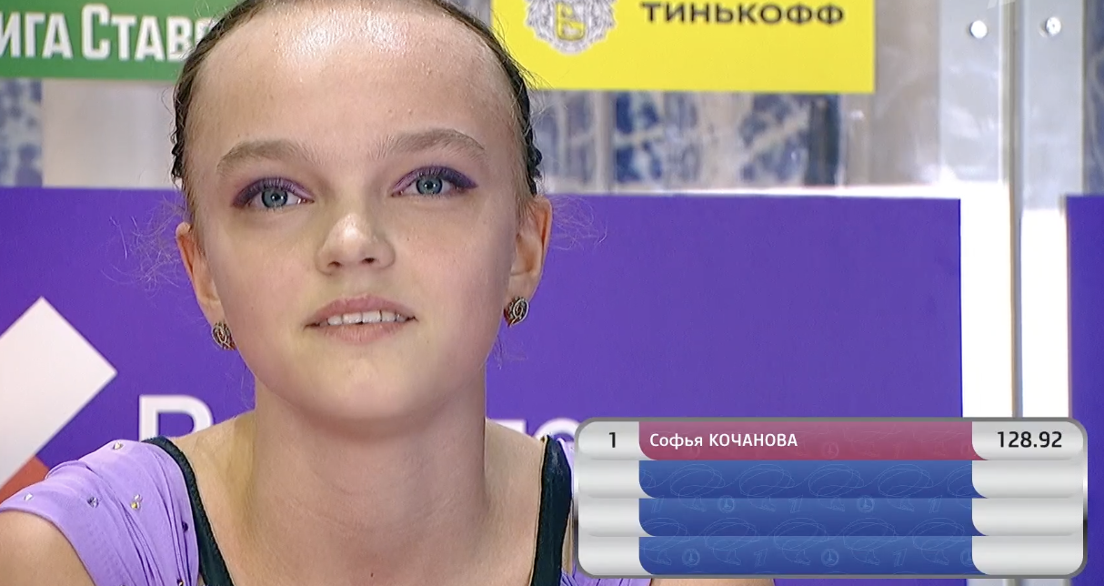 Так, Кочанова резко перевалилась на вторую ногу и чуть не упала после двойного сальхова, который должен был быть тройным.