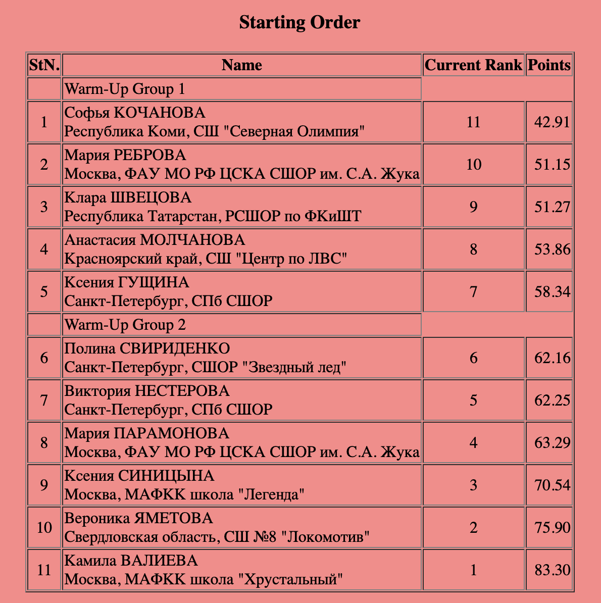Началась разминка второй группы фигуристок. Совсем скоро мы увидим битву Валиевой и Яметовой.