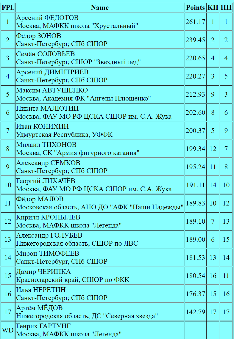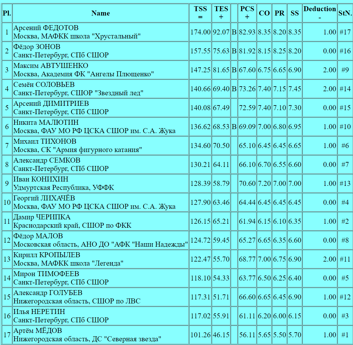 Федотов начинает с четверного тулупа, небольшой недркрут был, но вот следующий за ним четверной сальхов сделан чисто! Каскад тройной аксель + двойной аксель сделан хорошо, сольный тройной флип — чистый. Каскад тройной аксель + тройной тулуп выполнен хорошо, а вот вращения набирают третий уровень. Каскад тройной лутц + ойлер + тройной сальхов — чисто! С сольным тройным лутцем все тоже весьма достойно. В целом, отлично справился фигурист со своим выступлением.