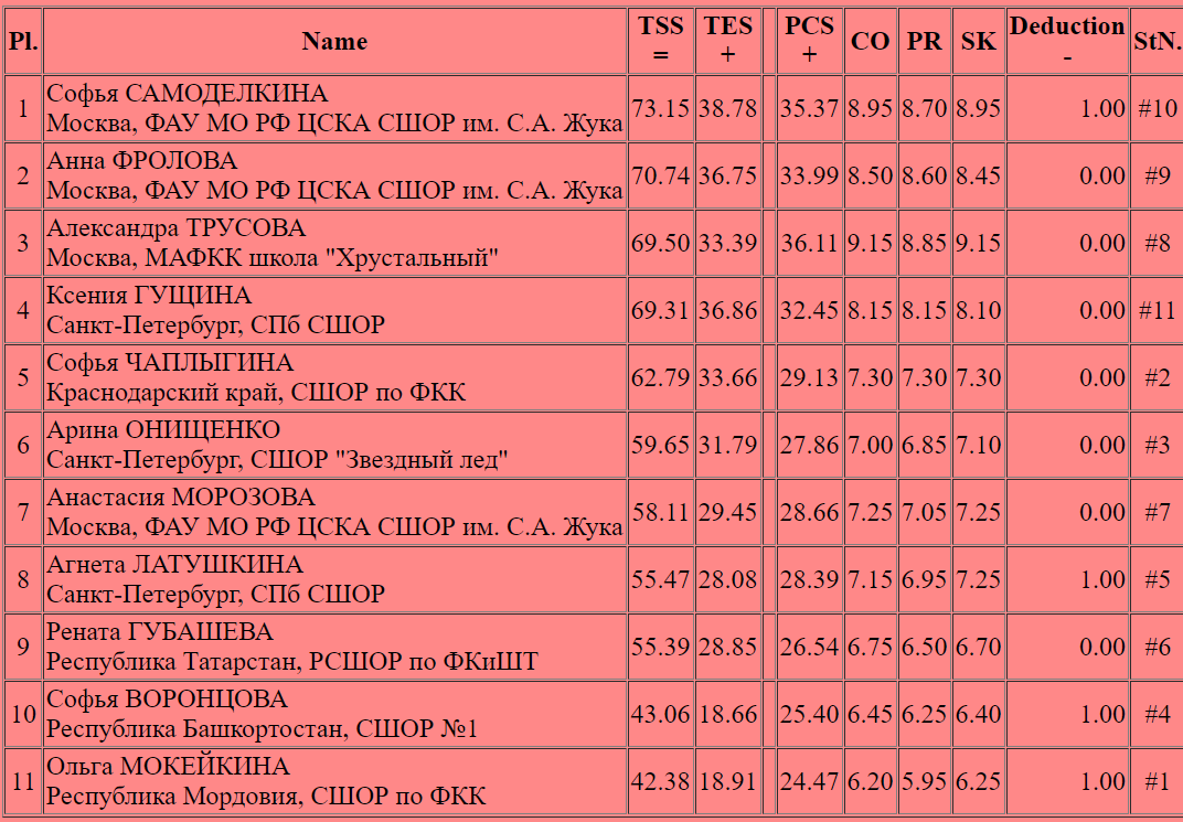 Самоделкина начинает с тройного акселя, но не получается он у фигуристки — падает она с него. Зато следом чисто она исполняет тройной флип. Каскад тройной лутц + тройной тулуп выходит без проблем, и фигуристка отлично справляется с хореографической частью — и вращения, и дорожка на третий и четвертый уровни. И в целом выступление практически удалось Софье, если бы не это падение на акселе.
