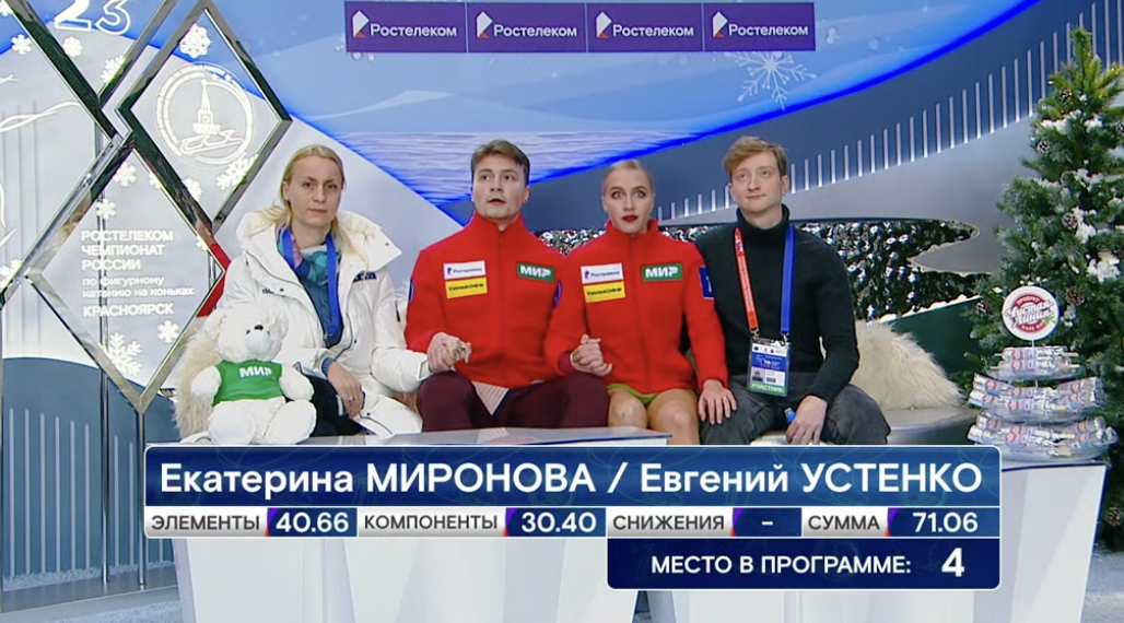 «Очень необязательная ошибка на тройном выбросе риттбергер, тем более что это коронный элемент этой пары, — говорит комментатор Первого канала и тренер этой пары Максим Траньков в прямом эфире. — Что-то пошло не так. Женя приземлилась на жесткую ногу и задела лед руками. Очень ненужная ошибка».