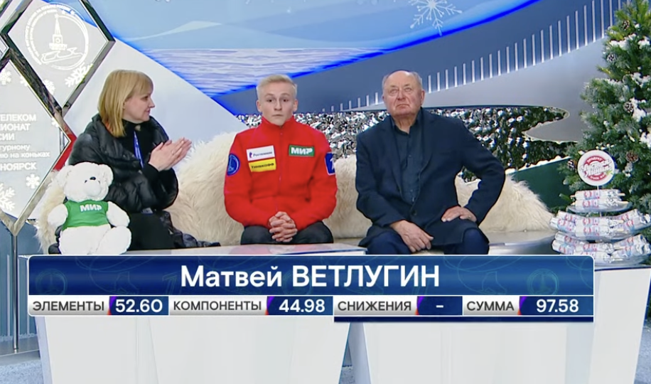Ветлугин получил за свою короткую программу 97,58 балла. Сам Матвей в шоке! Таких оценок он никогда не получал. Это промежуточное четвертое место.