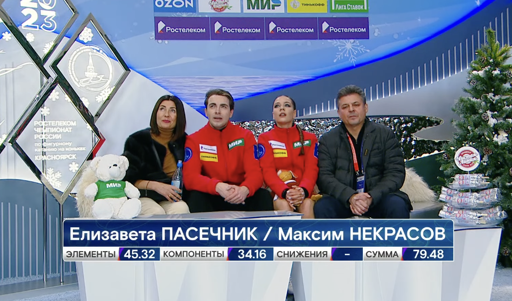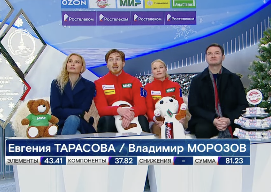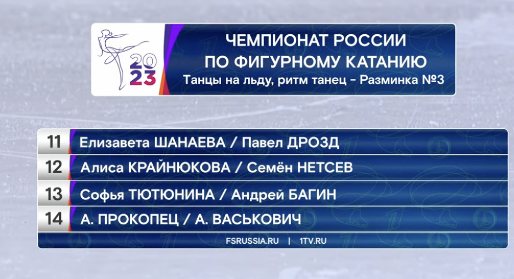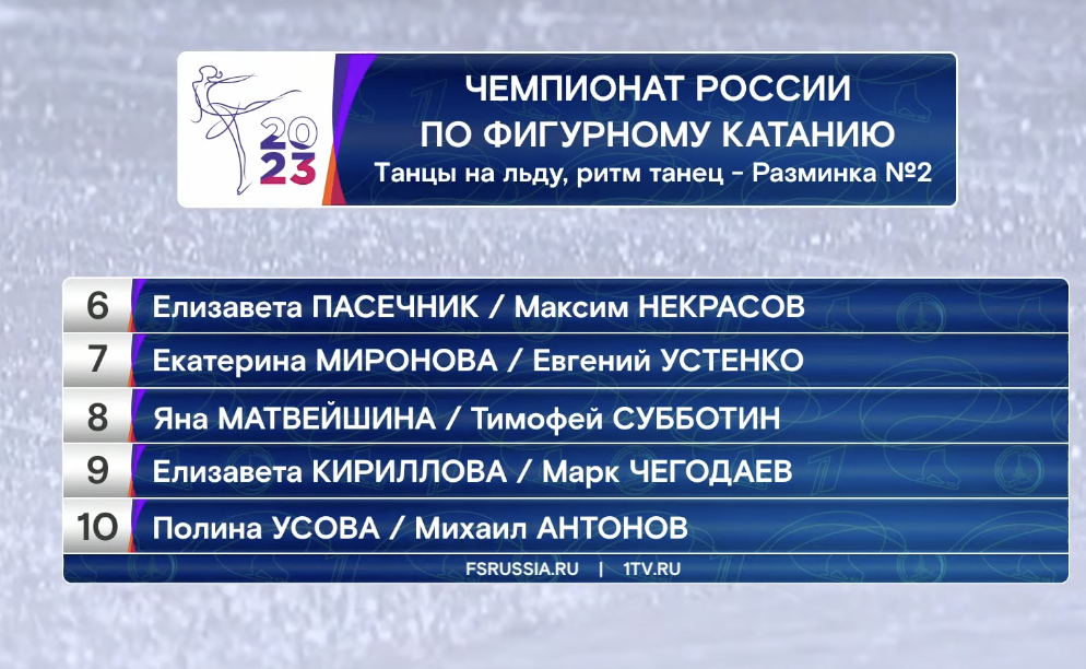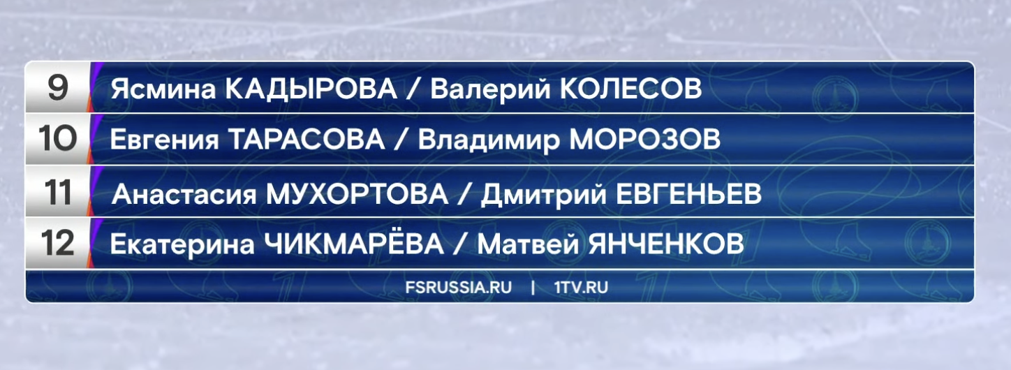 Сейчас у нас перерыв на заливку льда, а потом мы увидим выступления финальной группы участников, среди которых будут серебряные призеры Олимпийских игр в Пекине — Евгения Тарасова и Владимир Морозов.
