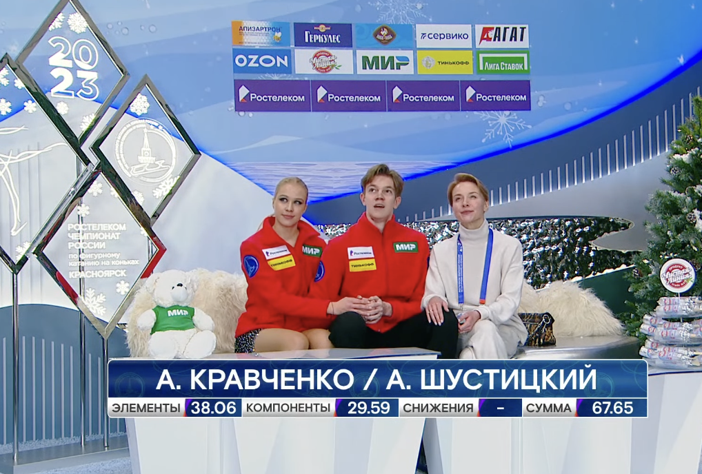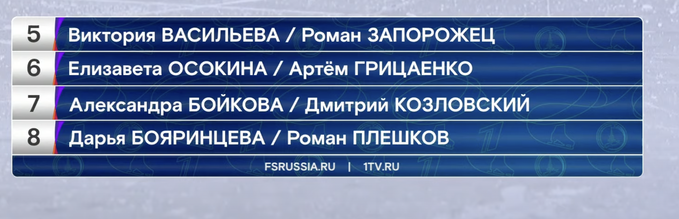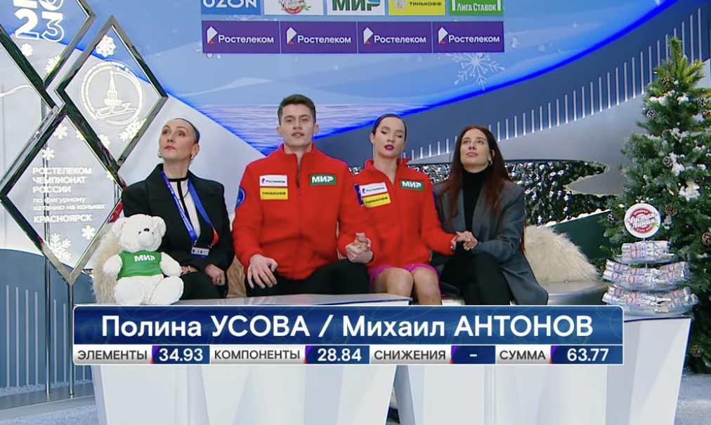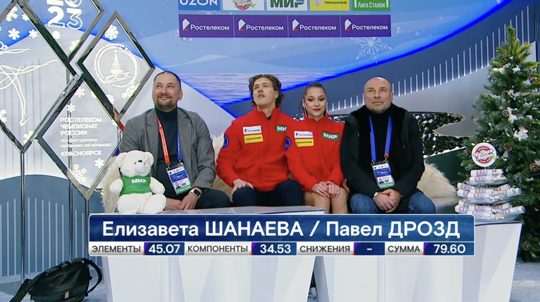 Сейчас у нас перерыв на заливку льда, а потом мы увидим выступления финальной группы участников, среди которых будут серебряные призеры Олимпийских игр в Пекине — Евгения Тарасова и Владимир Морозов.