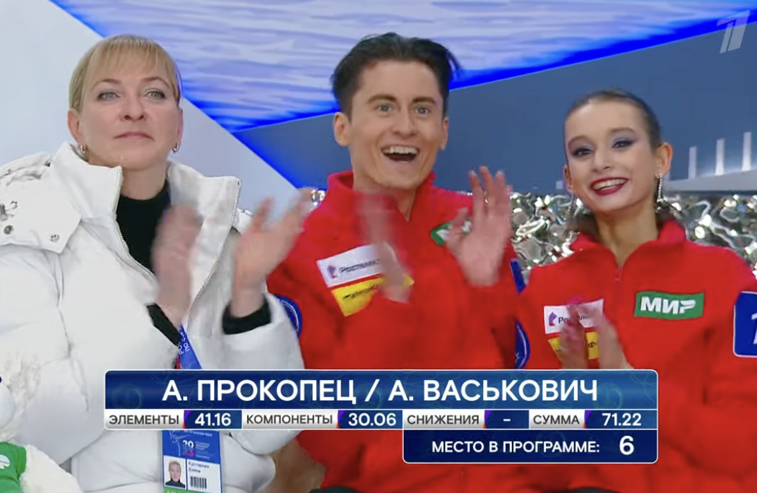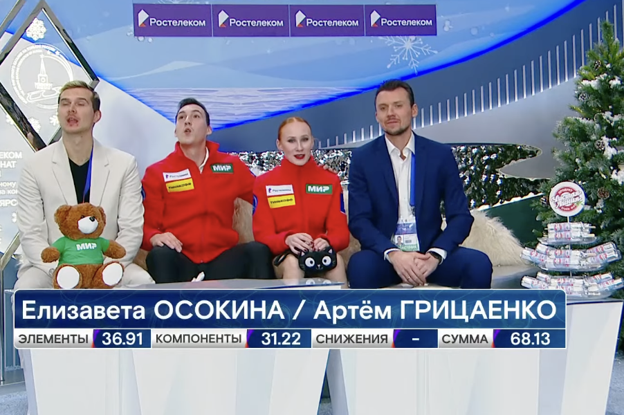 Осокина и Грицаенко неплохо выступили в короткой программе, не считая той помарочки на выезде с выброса и тодеса (всего на первый уровень). В остальном у них получились солидные парные элементы — и даже финальное параллельное вращение было оценено на четвертый уровень сложности.