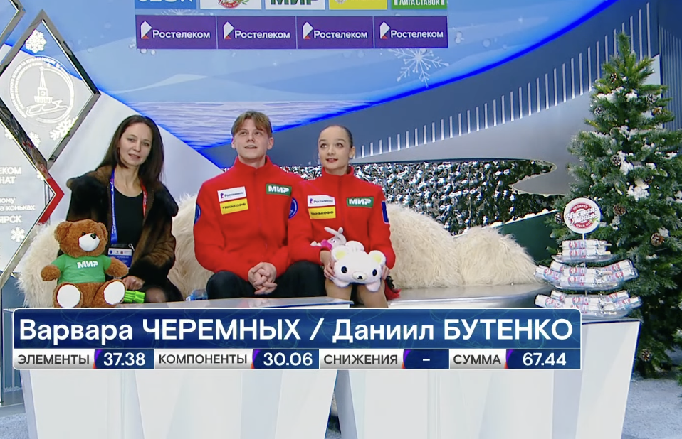Следующими выступают Варвара Черемных и Даниил Бутенко. Они катаются под итальянскую композицию La Strada (саундтрек к фильму «Дорога»).