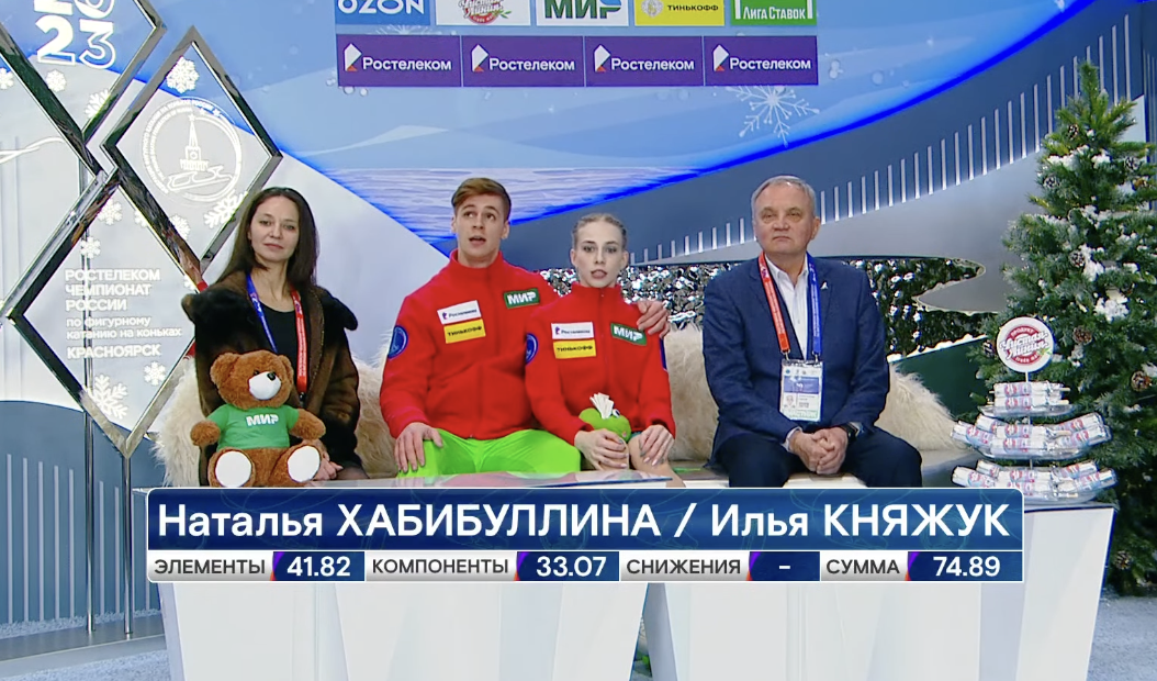 Следующими выступают Елизавета Худайбердиева и Егор Базин — одни из главных фаворитов чемпионата России! Они катаются под California Dreaming и I Like It Like That (Cardy B).