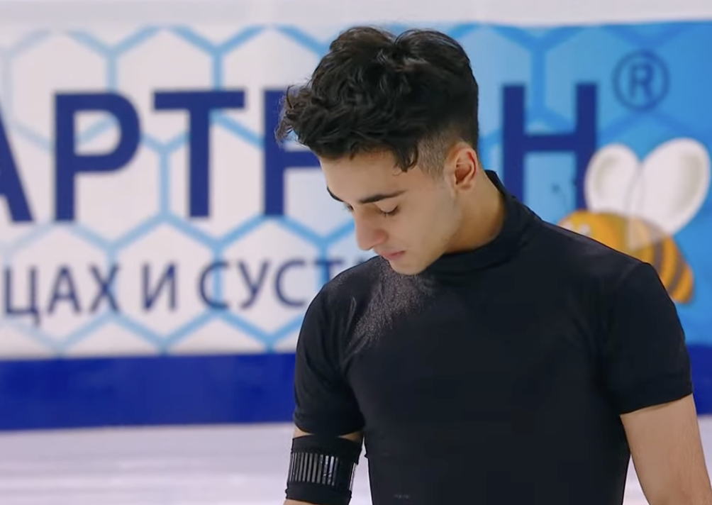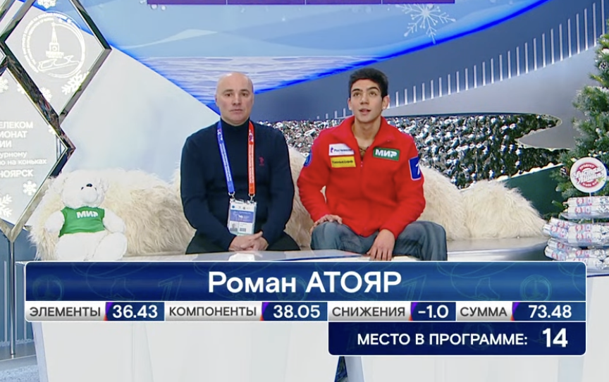 Следующим выступает Роман Атояр из Санкт-Петербурга. Он катается под драматичную композицию Globus — Sarabande Suite.
