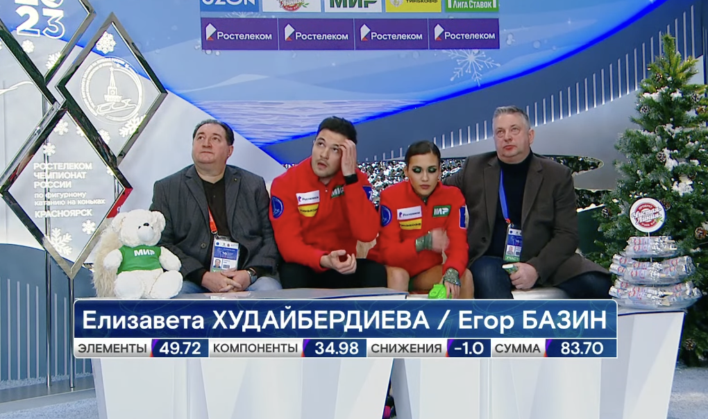 Худайбердиева и Базин получают огромные оценки за свой прокат с двумя явными ошибками Худайбердиевой — 83,70. Зрители кричат им: «Нечестно!». Елизавета отводит глаза и уходит, Егор в ответ посылает саркастичный воздушный поцелуй.