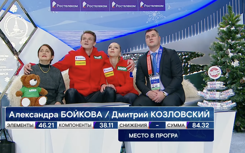 Бойкова и Козловский получили за короткую программу 84,32 балла. Они заняли промежуточное второе место, чуть уступив Мишиной и Галлямову.