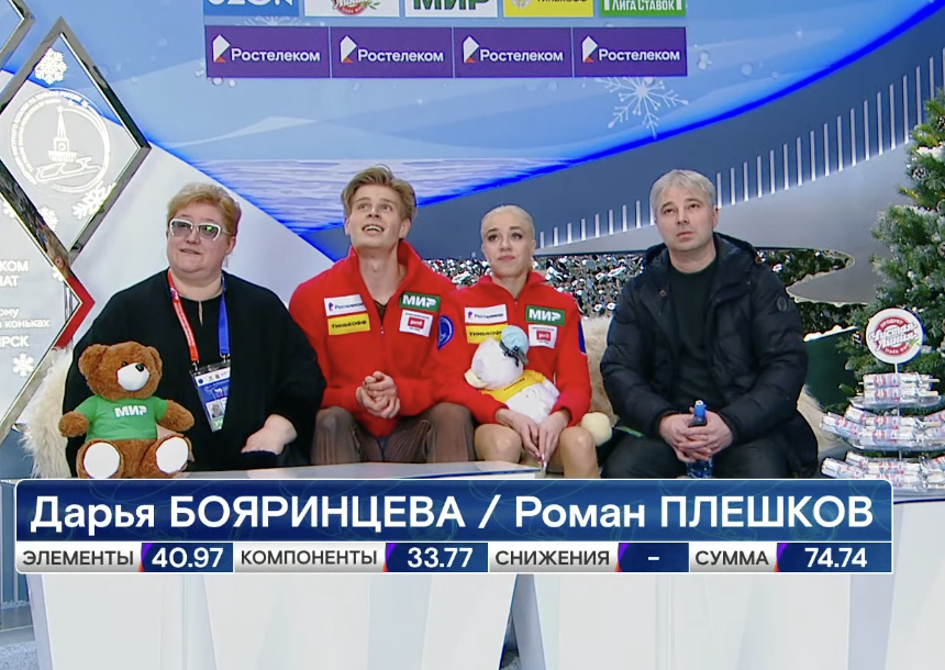 Следующими выступают Дарья Бояринцева и Роман Плешков. Они катаются под балет Арама Хачатуряна «Спартак» (адажио).