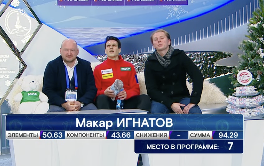Ох, Игнатов немного неудачно приземлился с тройного акселя — кажется, чуть недокрутил, тяжело врезался в лед и потом накренился в сторону, но быстро выровнял полет. Судьи сняли всего 0,32 балла за эту помарку.