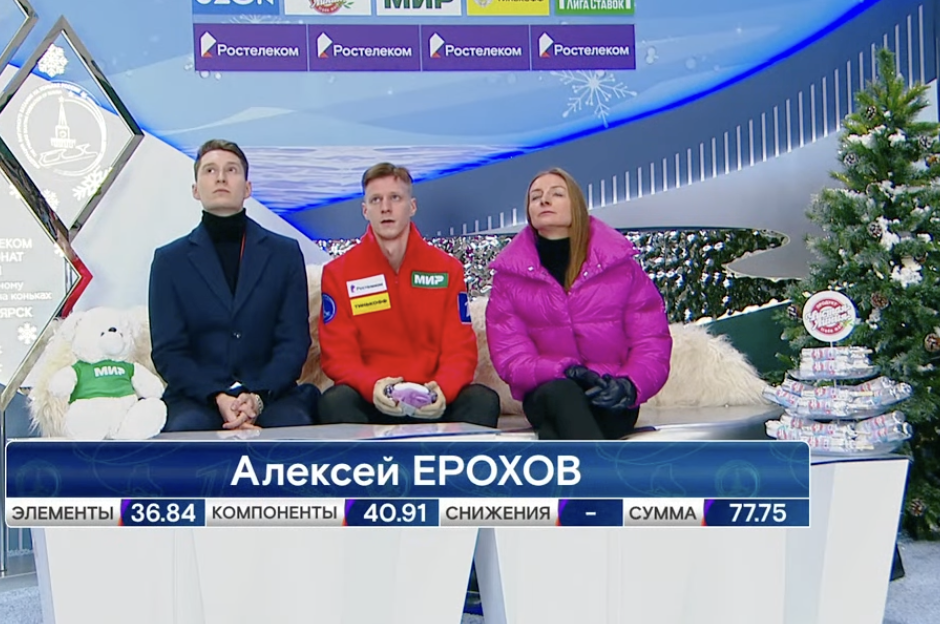 Последний элемент — сольный четверной тулуп — исполнен изумительно! Мозалев — первый одиночник сегодня, который чисто исполнил все свои прыжки. Арена в Красноярске взрывается аплодисментами.