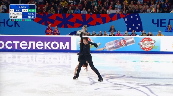 Сразу качественный твист, затем с ошибкой сделали секвенцию 3 сальхов + 2 аксель. В итоге не сумели еще один аксель присоединить. Двойной тулуп вышел с рассинхроном, а первую часть проката закончили хорошим выбросом тройной флип. Во второй качественное 5 аксель лассо, отличный выброс тройной риттбергер, да и остальные элементы были на уровне под зажигательную музыку.