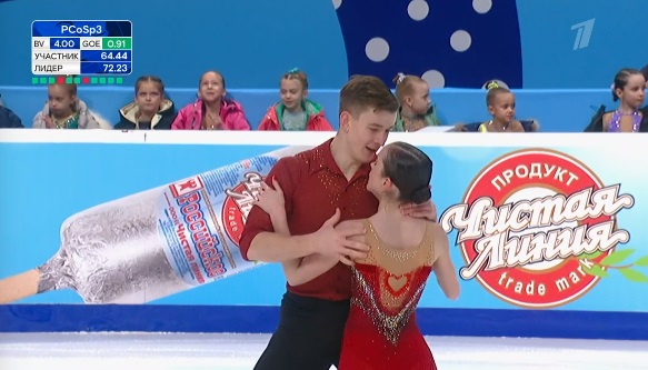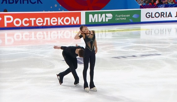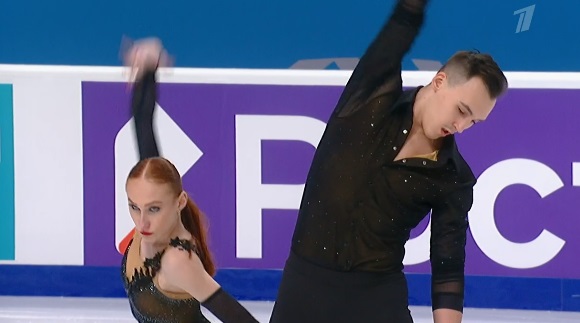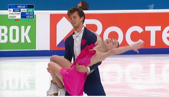 Сразу сделали блестящую секвенцию 3 сальхов + 2 аксель + 2 аксель. Продолжили тройной подкруткой четвертого уровня, выполненной на +2 балла. А вот параллельный тройной тулуп не вышел у партнерши. Очень сильные поддержки, выброс тройной флип тоже на уровне. Во второй части проката практически идеальный выброс тройной риттбергер. Замечательное выступление, но с одной ошибочкой.