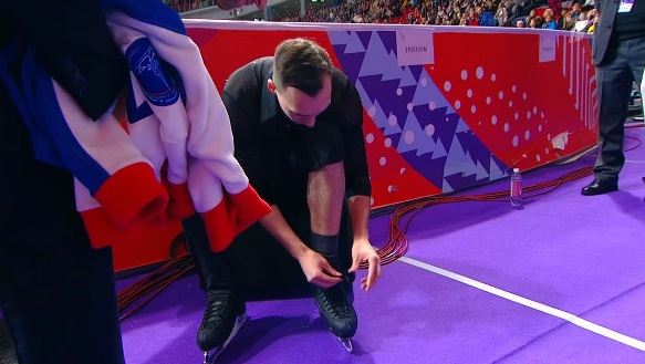 Ого, проблемы с костюмом у партнера. Лопнул шнурок. А программа-то, как будто, продолжается. Музыка идет...