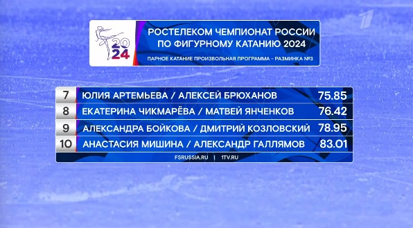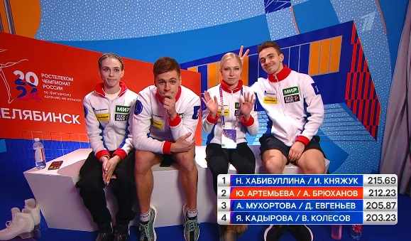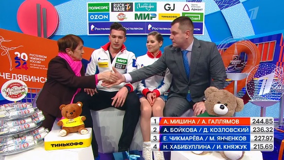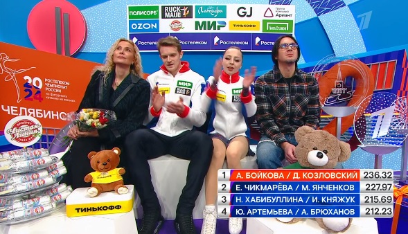 Убедительная победа Мишиной и Галлямова, которые теперь тоже стали двукратными чемпионами страны. Отмечаем серебро Бойковой и Козловского, а также первую бронзу Чекмаревой и Янченкова. Сделаем небольшую паузу и вернемся для того, чтобы посмотреть выступления одиночниц.