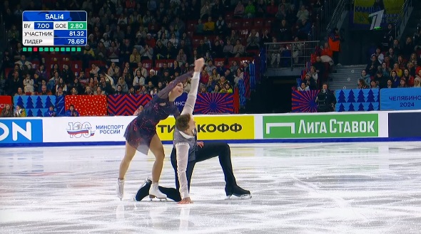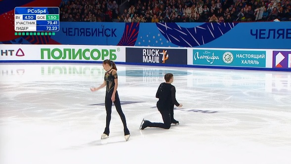 Сразу же твист в четыре оборота! Дальше параллельный каскад 2 аксель + ойлер + 3 сальхов. Потом тройной тулуп. Все чисто и параллельно. И только на выбросе тройной лутц случилось приземление партнерши на две ноги. Во второй части проката ошибка на выбросе тройной риттбергер. Отличное 5 аксель лассо, да и в целом прокат получился очень качественный, несмотря даже на два выброса с неудачным выездом.