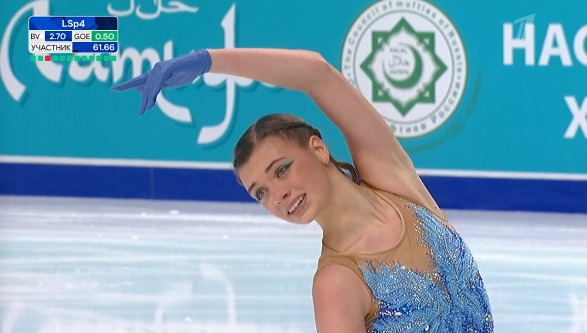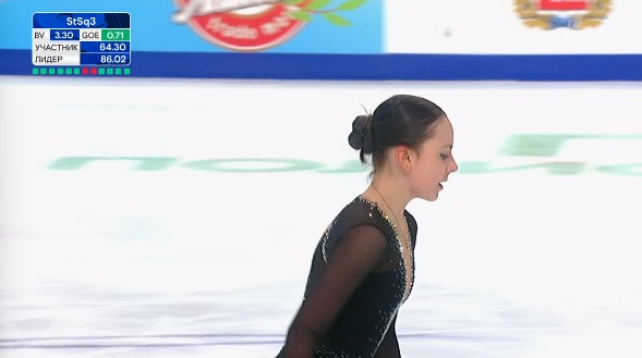 Начала с каскада 3 лутц + 3 тулуп, потом сделала двойной аксель, справилась и с тройным флипом. Тройной риттбергер. Каскад 3 лутц + 2 тулуп + 2 риттбергер сделала уверенно, а вот нпа следующем каскаде упала с превого же прыжка — тройного риттбергера. И следом более-менее чисто сделала 2 сальхов + 2 тулуп. Дорожка только на второй уровень, вращения — на третий. Многовато ошибок в итоге.