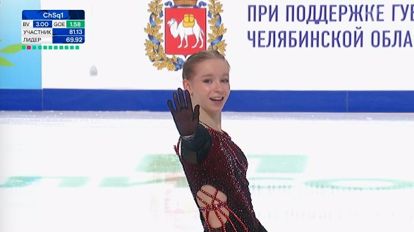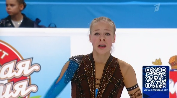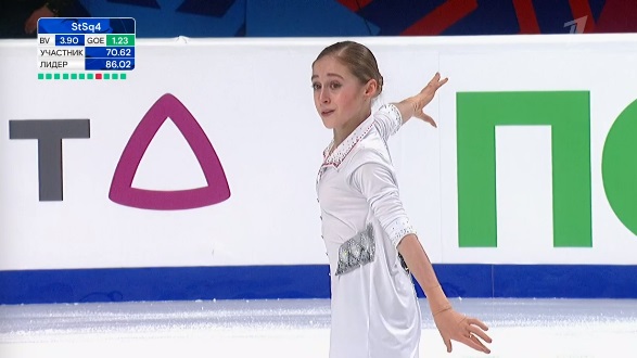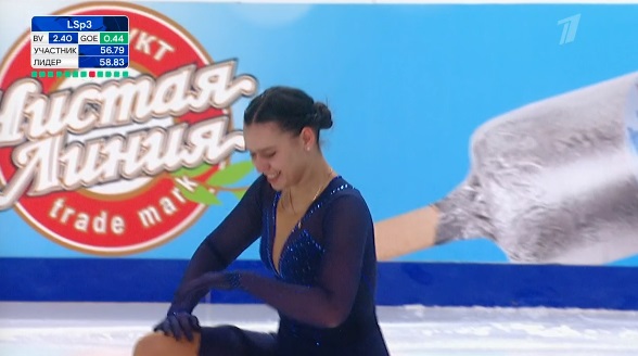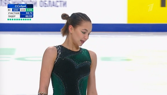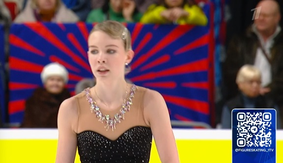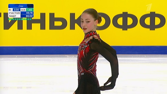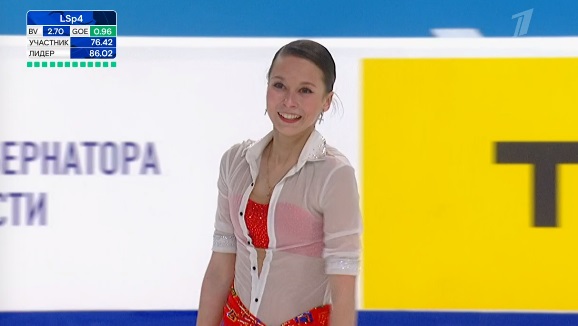 Двойной аксель в начале проката, дальше чисто сделала каскад 3 лутц + 3 тулуп, прыгнула тройной риттбергер и дальше вращение четвертого уровня закрыло первую часть программы. Во второй части тройной сальхов прошел чисто, секвенция 3 флип + 2 аксель + 2 тулуп. Дальше тройной флип. И дальше четвертый уровень вращения и третий — дорожки.
