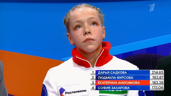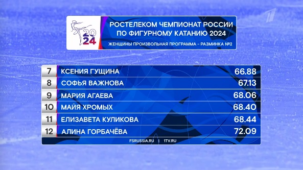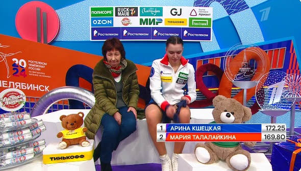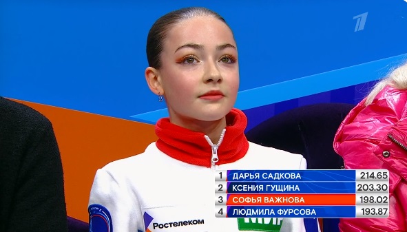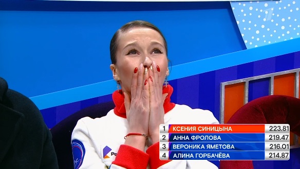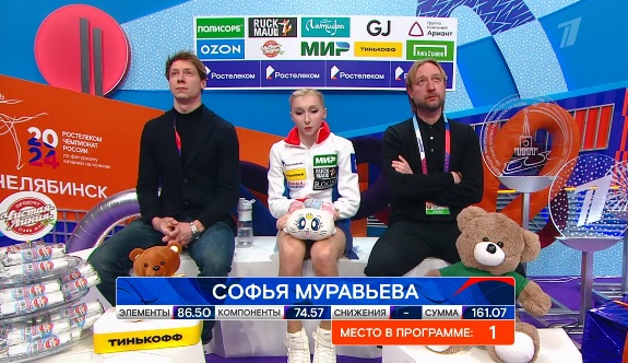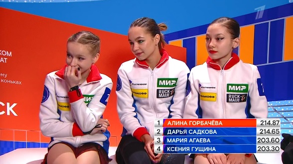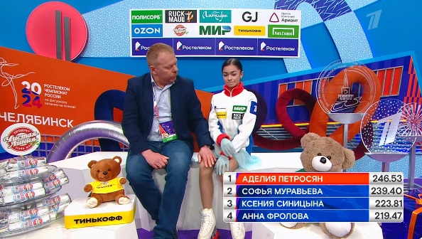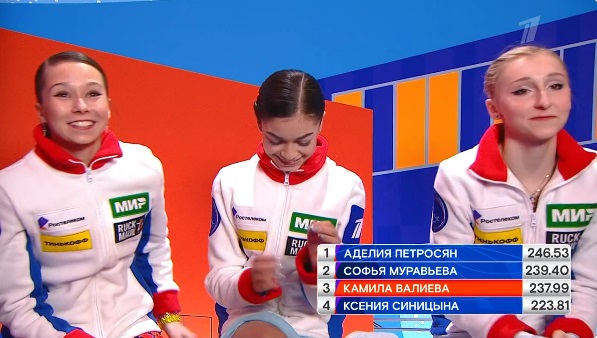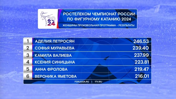 Итак, Аделия Петросян становится чемпионкой страны! Софья Муравьева занимает второе место, а Камила Валиева остается только третьей. Вот такие итоги чемпионата России по фигурному катанию! Спасибо, что были с нами, и до новых встреч. Трансляцию вел Александр Седов.