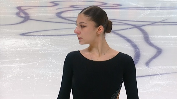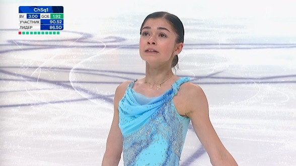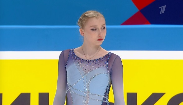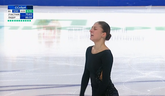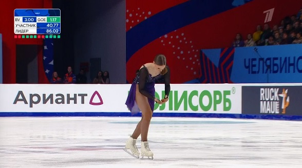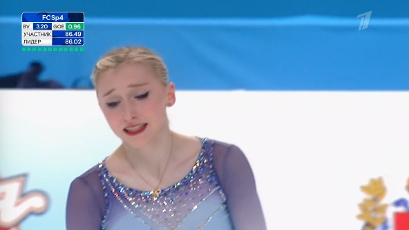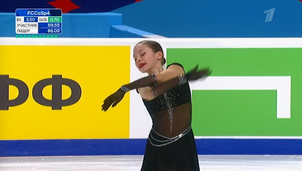 Не вышел четверной тулуп. Каскад 3 флип + 2 тулуп сделала, как и тройной риттбергер и тройной сальхов. Четвертый уровень вращения, само собой. Дорожка шагов тоже четвертого уровня, и дальше прыжковая часть второй половины проката. Чистый каскад 3 лутц + 3 тулуп, чистая секвенция 3 флип + 2 аксель + 2 аксель. И чистый тройной тулуп. Ну и завершили все вращения максимального уровня. Красивый, чувственный прокат. Но хватит ли этого, чтобы обойти Аделию Петросян?