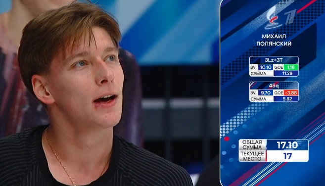 Михаил Полянский начинает с каскада 3 лутц + 3 тулуп. Чисто, хоть и база маленькая. И тут же прыгает сольный четверной сальхов! Правда, приземляется не особо удачно. Еще одна попытка сальхова, но он выходит двойным.