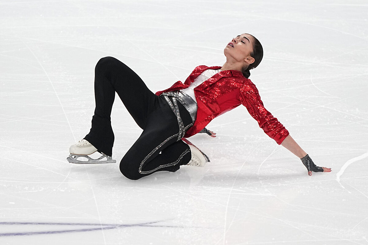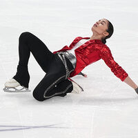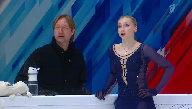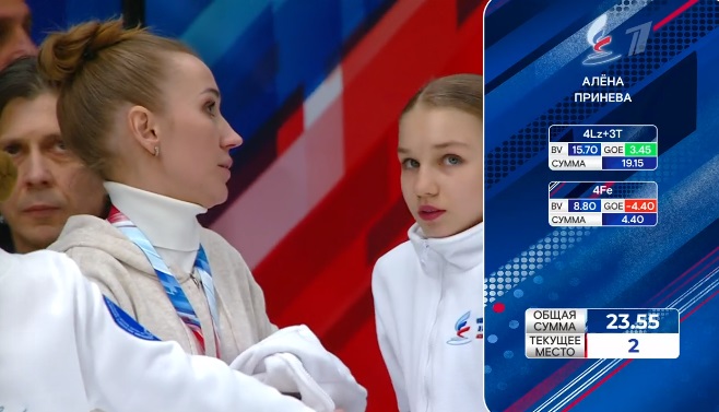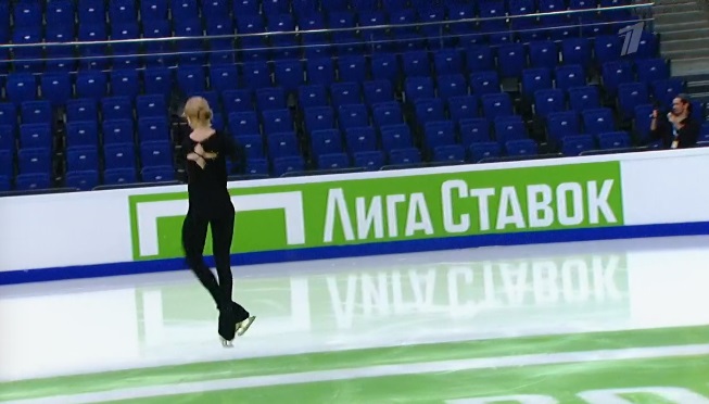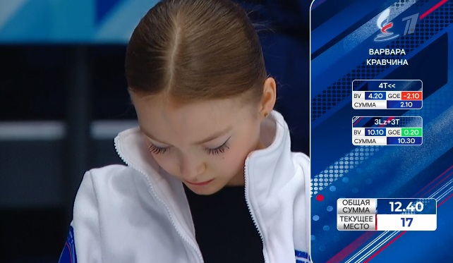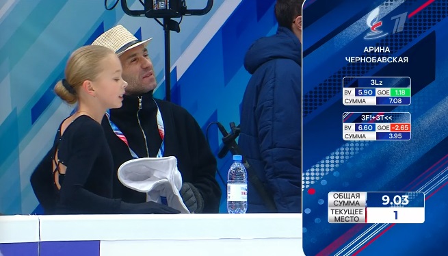 Арина Чернобавская сразу неплохо исполняет тройной лутц, а вот каскад из тройных флипа и тулупа срывает. Время еще остается (дается минута на все про все), так что она пытается сделать еще прыжок. Падает с тройного акселя, а потом падает с четверного тулупа.