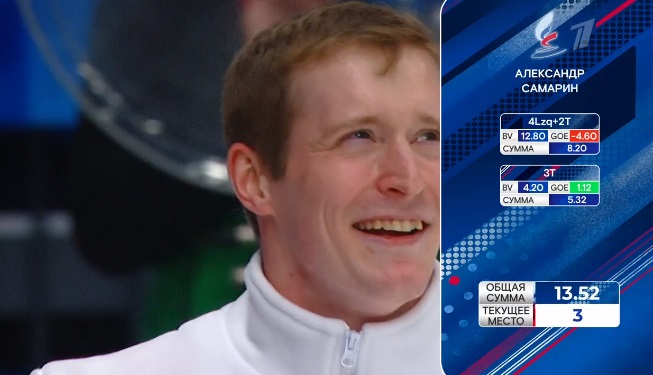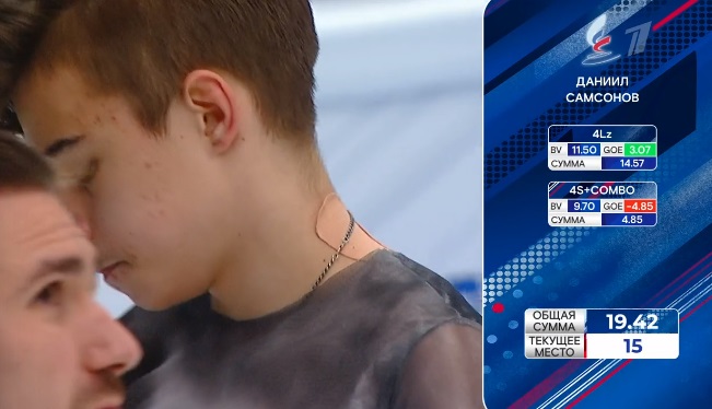 Даниил Самсонов чисто прыгает четверной лутц! Дальше пробует каскад, но сальхов выходит двойным. Потом падает с четверного сальхова, начиная им каскад. В итоге прыгает только каскад 2 сальхов + 2 тулуп. Этого очень мало.