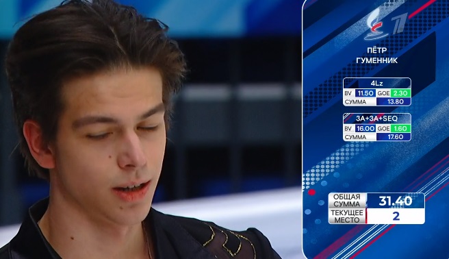Петр Гуменник сразу же чисто делает четверной лутц, а затем и каскад из двух тройных акселей. Тоже чисто. И даже полминуты времени не потратил.