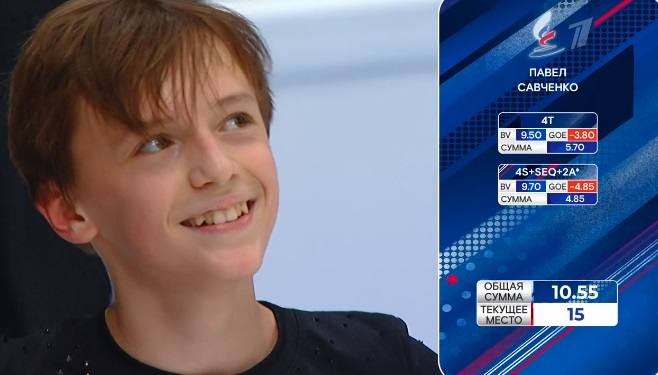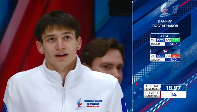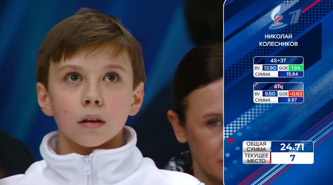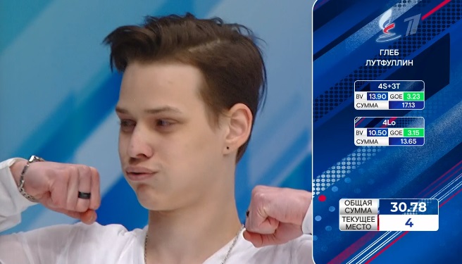 Глеб Лутфуллин прыгает чистый каскад 4 сальхов + 3 тулуп, а потом и чистый четверной тулуп! В итоге решает напоследок исполнить четверной риттбергер! Тоже чисто! Алексей Мишин доволен.
