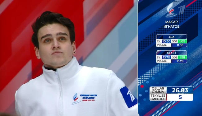 Макар Игнатов сразу прыгнул четверной риттбергер! Хотя и есть что улучшить, если останется время. Но уже не исправить — первый прыжок неудачным был, и он пошел как сольный двойной тулуп. Но затем здорово исполнил каскад 4 тулуп + 3 тулуп.