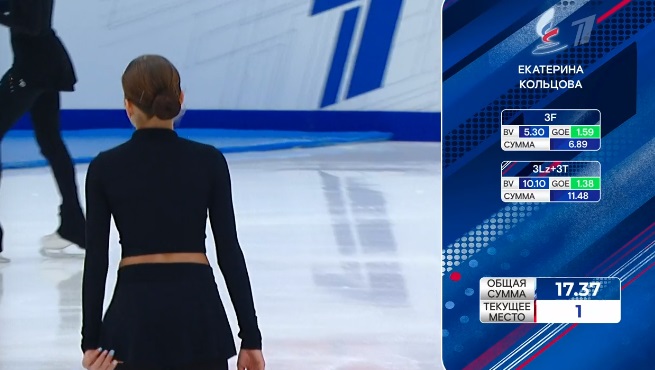 Екатерина Кольцова сразу прилично исполняет тройной флип, а затем делает каскад 3 лутц + 3 тулуп. Но есть еще полминуты, и она пыталась сделать каскад посложнее, но упала с риттбергера. И еще есть попытка: чистый тройной риттбергер.