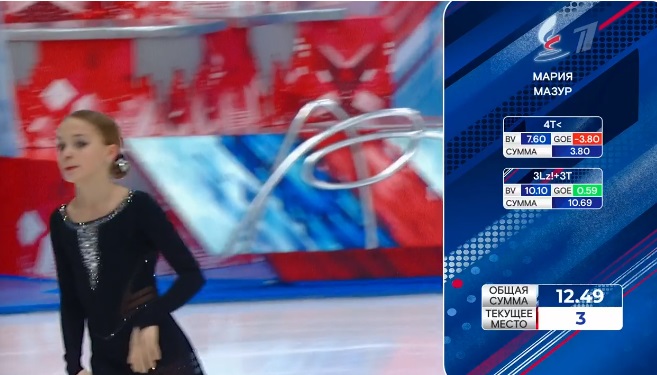 Мария Мазур из академии Плющенко сразу исполняет четверной тулуп, но падает. Дальше получился только двойной тулуп. Время остается еще, и она делает 3 лутц + 3 тулуп — чисто. Потом пытается четверной тулуп сделать, но падает снова.