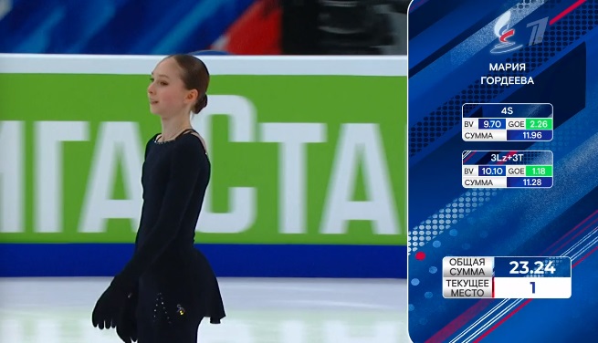 Мария Гордеева сразу делает чистый четверной сальхов! Каскад не получается, но есть время повторить. Делает 3 лутц + 3 тулуп. Не идеально, но сделано.