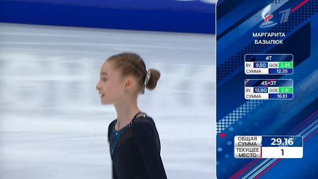 Ученица Этери Тутберидзе Маргарита Базылюк сразу же делает шикарный четверной тулуп! А затем каскад четверной сальхов + тройной тулуп! Ого! И еще раз делает этот же каскад, причем улучшает!
