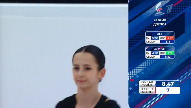 София Дзепка начала с тройного лутца и упала. Каскад 3 лутц + 3 тулуп сделала. Четверной сальхов сорвала — вышел двойной. И в конце пошла еще раз на четверной сальхов, но упала.