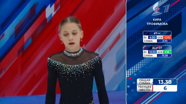 Кира Трофимова делает двойной тулуп вместо четверного, затем чисто прыгает каскад 3 лутц + 3 тулуп. Дальше падает с четверного тулупа, а затем перепрыгивает тот же каскад с улучшением.