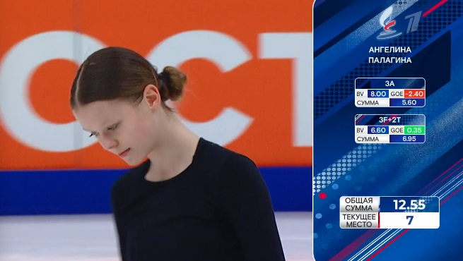 Ангелина Палагина прыгает тройной аксель, но падает. Пробует еще раз, но все же на руки приземляется. Заходит на каскад и падает с тройного флипа. И на последней секунде вроде бы успевает начать каскад 3 флип + 2 тулуп уже на последнем издыхании.