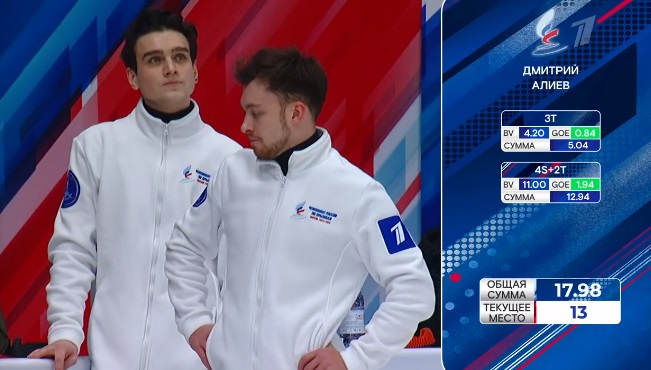 Падает с четверного тулупа Дмитрий Алиев. В итоге вместо повторения делает только тройной. Все зависит от каскада теперь, и там 4 сальхов + 2 тулуп. Красиво. И напоследок еще и сальто назад сделал вне зачета! Но, похоже, не пройдет.