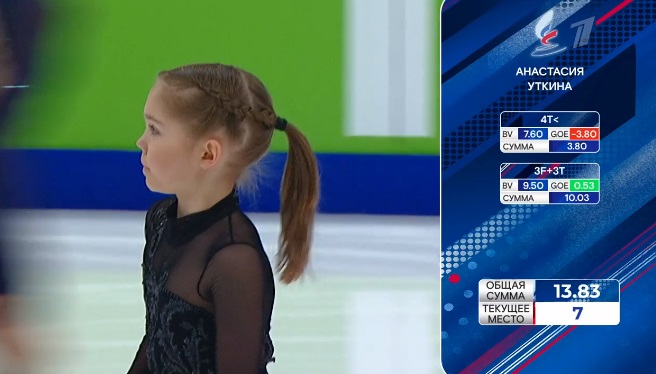 Четверной тулуп с недокрутом и падением у Анастасии Уткиной. На повторении — то же самое. Дальше чистый каскад 3 флип + 3 тулуп. Ну и осталось время, которое она потратила на исправление каскада, сумев прибавить.