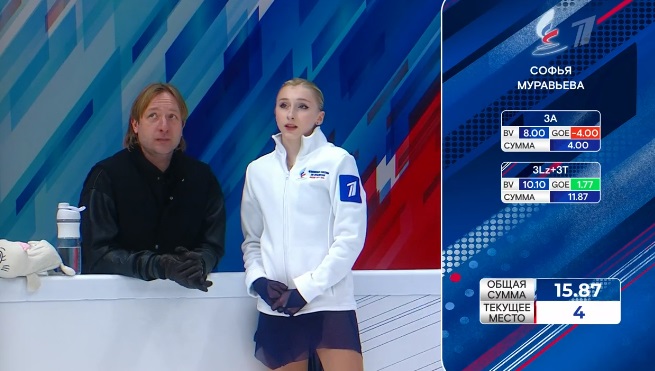 Софья Муравьева заходит на тройной аксель и падает. Пытается повторить, но прыгает в один оборот. Дальше чисто исполняет каскад 3 лутц + 3 тулуп.